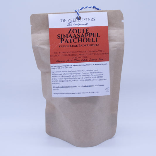 Zalige Luxe Badkruimels met 100% zuivere etherische olie van Zoete Sinaasappel en Patchoeli