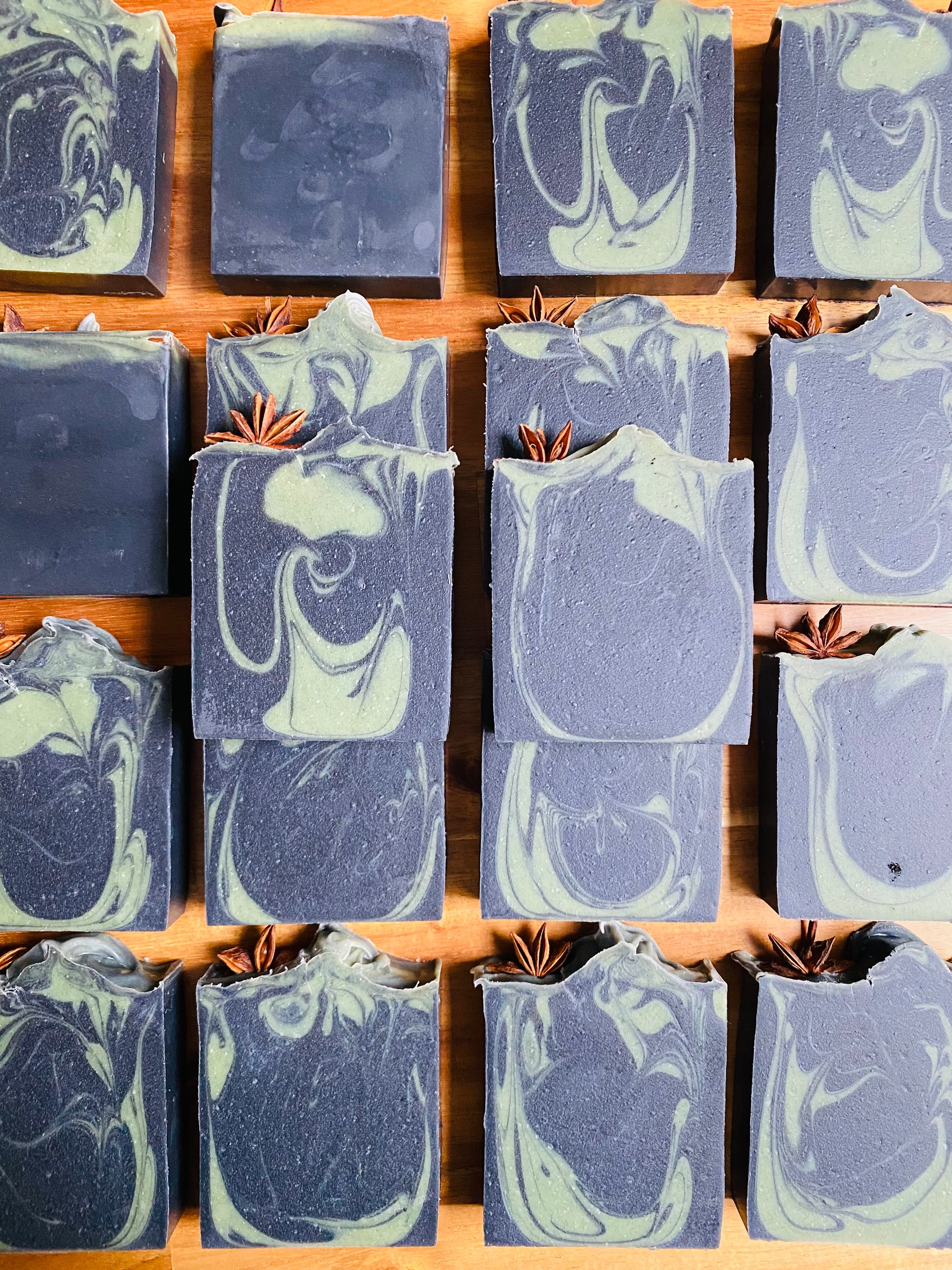 Sodium Shea Butterate, Sodium Olivate, Sodium Cocoate, Sodium Sunflowerseedate, Sodium Castorate, Aqua, Glycerin, Butyrospermum Parkii Butter, Olea Europaea Fruit Oil, Cocos Nucifera Oil, Helianthus Annuus Seed Oil, Ricinus Communis Seed Oil, Cedrus Atlantica Wood Oil, Pogostemon Cablin Leaf Oil, Cinnamomum Zeylanicum Leaf Oil, Citrus Sinensis Peel Oil, Charcoal Powder, Illite (Green Clay), Spirulina Platensis Powder, Limonene*, Linalool*, Eugenol*, Benzyl Benzoate*, Cinnamal*